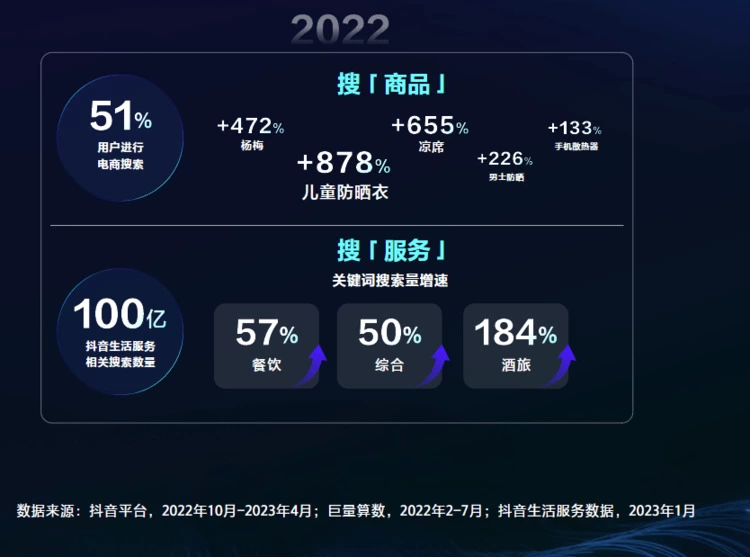 与此同时,越来越多的用户期待通过搜索体验生活、解决实际需求。抖音平台数据显示,在2022年,有51%的用户会进行电商搜索。同时,抖音生活服务数据也显示,在2023年1月,抖音生活服务相关搜索数量也超100亿,越来越多的用户开始使用搜索在抖音平台内找商品、找服务。