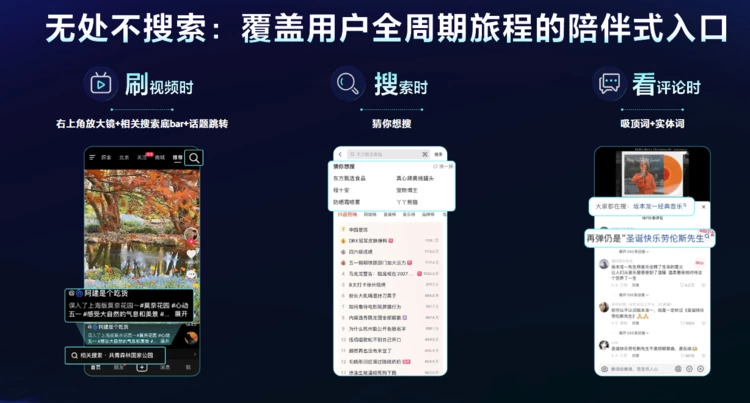 从单日最高200多万次搜索的“黄桃罐头”到半年搜索量超3000万次的“淄博烧烤”,在搜索功能的助力下,越来越多有趣内容和生活方式被更多用户看到、参与。在从单一入口升级为多元入口后,巨量搜索覆盖用户使用的全旅程、全场景,现在人们不仅可以在抖音边刷视频边搜索,在直接搜索时发现更多想搜推荐,还可以在看评论时实时搜索可能感兴趣的知识。