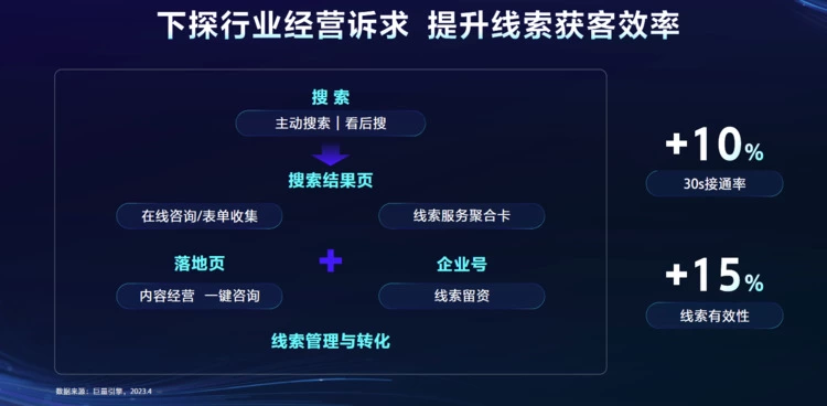 以线索场景为例,在巨量引擎完善的营销链路助力下,当前的商家不仅可以通过线索原生咨询、线索服务聚合卡等不同结构化的结果页承接用户搜索诉求,还可以通过企业号、落地页二次触达目标用户,加强线索管理,以跟随式服务加速目标转化。