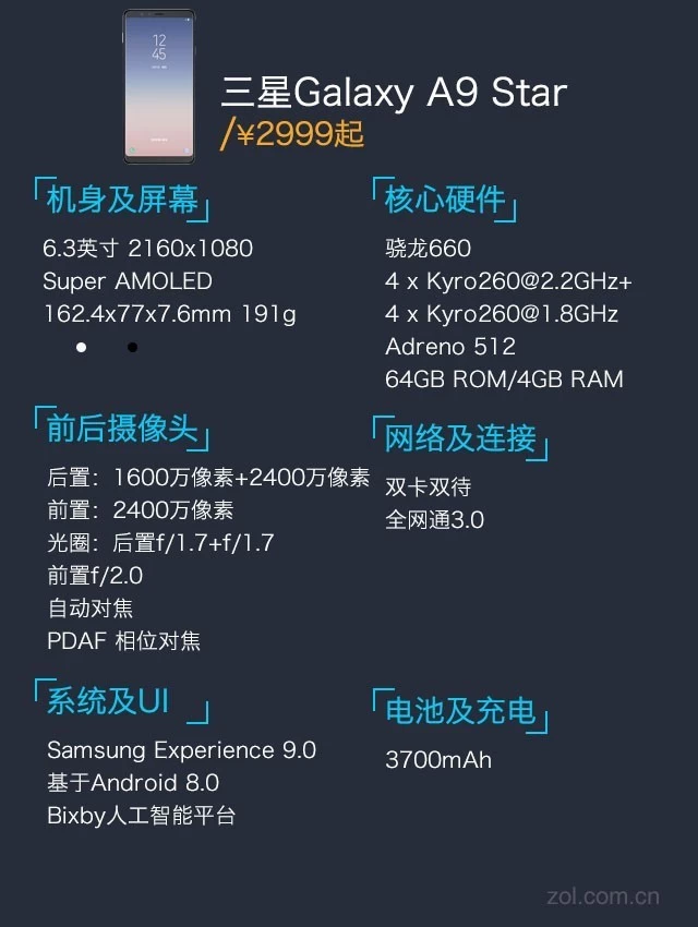 轻薄的三星Galaxy A9 Star设计上融入了大量类似平板的“大”元素:6.3英寸 Super AMOLED大屏,无论是打游戏还是日常使用都非常舒爽;直面全面屏,机身的额头及下巴都显得十分的窄。搭载全面屏神U骁龙660移动平台,辅以4GBRAM+64GBROM,搭载当代公认好用的人工智能平台Bixby。三星Galaxy A9 Star配备3700mAh电池,就算是高屏占比的全面屏,也足够使用一整天。