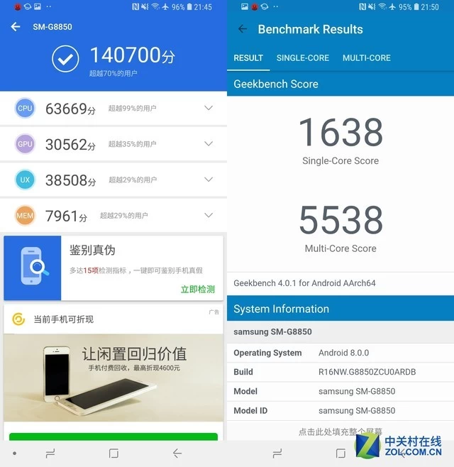 最终,三星Galaxy A9 Star安兔兔跑分为140700分;GeekBench4跑分单核为1638,双核为5538,能够满足用户日常使用需求。