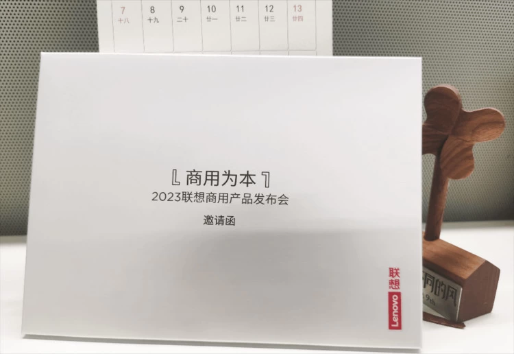 这份邀请函用一个银色信封封装,十分简洁,仅印制了“‘商用为本’2023联想商用产品发布会邀请函”几个字和红色的联想LOGO。打开信封,是一个按一定比例制作的笔记本电脑模型,向外界透露了此次商用产品发布会的更多细节。