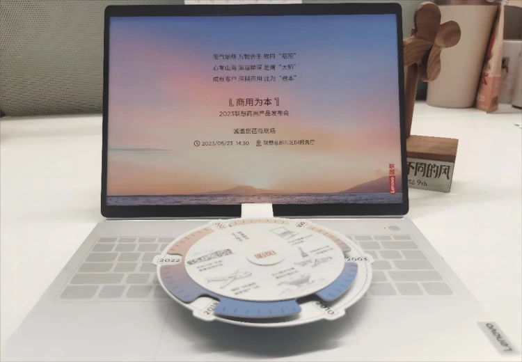 值得一提的是,模型键盘上放置了一个时间轮盘,当模型呈180°打开时,相应的联想昭阳大事件便和事件年份一一对应,颇具创意。这或许也透露出,联想昭阳全系产品将标配屏幕可180°翻转的设计理念。