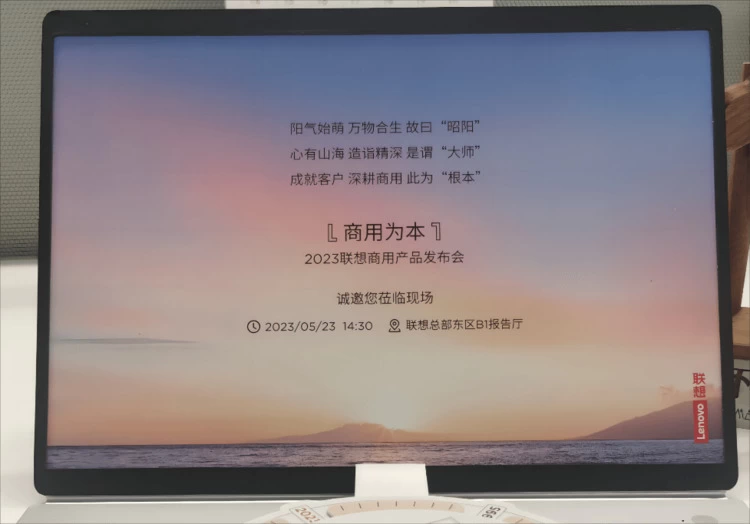 此外,在电脑模型屏幕上,联想还打出了“阳气始萌 万物合生 故曰‘昭阳’”“心有山海 造诣精深 是谓‘大师’”“成就客户 深耕商用 此为‘根本’”等字样,在透露其即将发布联想昭阳商用笔记本、ThinkCentre M大师旗舰产品和ThinkStation工作站等商用产品的同时,也彰显着联想对于商用的深刻理解。