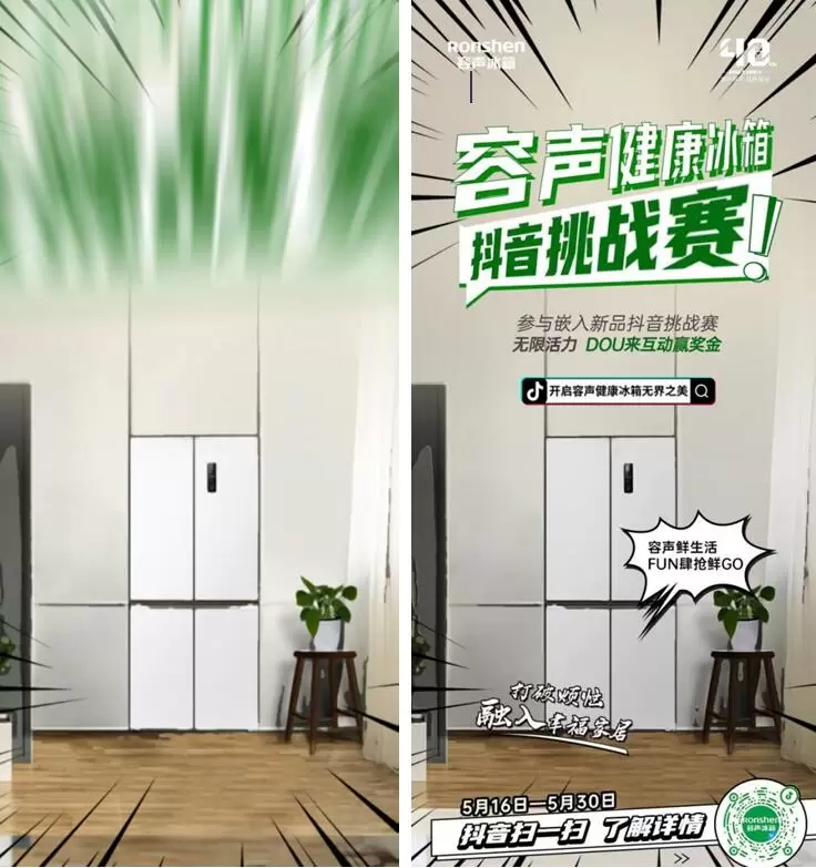 此前,容声冰箱已通过#容声健康冰箱喊你躲猫猫#话题挑战赛,以3.2亿次播放量炸燃抖音平台,活动参与者源源不断,单人最高收益已达千元,该活动通过躲猫猫的创意话题,成功卷入海量粉丝参与,完美诠释容声冰箱嵌入新品融入橱柜的优势。本次挑战赛活动,容声冰箱再次创新玩法,通过容声冰箱融入生活的前后反差场景,深刻共鸣用户家居生活的烦恼,以多样趣味的方式,营造温馨美好的氛围,为用户带来全然不同的互动体验!
