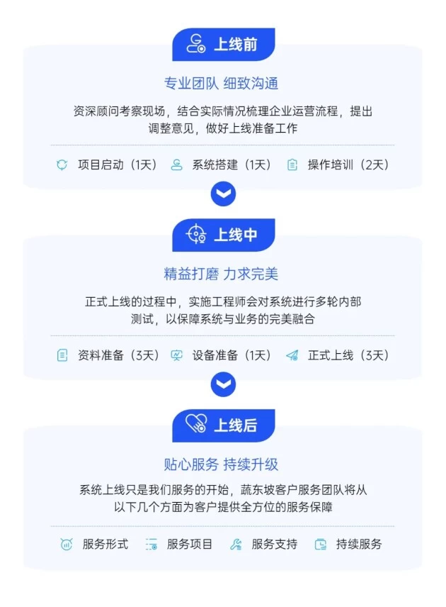 实施从来都是软件上线的重要环节。实施的专业度甚至一定程度上决定项目的成败。因此,蔬东坡坚持全流程项目管理+1V1专属服务。上线前,蔬东坡会成立包含项目经理、业务顾问、技术支持、售后保障成员等在内的多对一专项小组,奔赴客户现场,确保数据顺利迁移、团队培训到位,真正帮助客户将软件用起来。