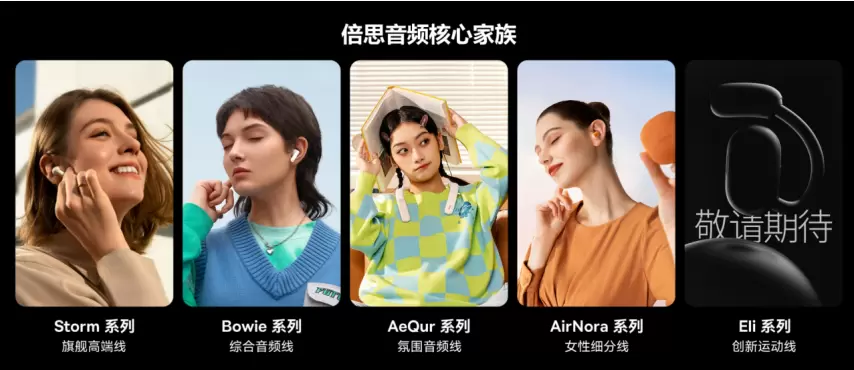 在活动上,Baseus倍思介绍了旗下核心音频产品线,包含 5 个系列:Storm、Bowie、AeQur、AirNora 和 Eli。