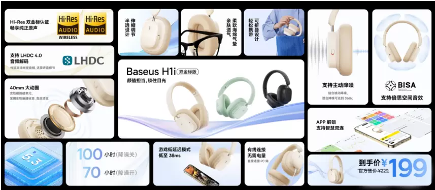 在这样的定位下诞生的倍思 Bowie H1i 头戴式降噪耳机,设计简约时尚,契合当下年轻人的审美;通过了日本 JAS 音乐协会的审阅,获得了 Hi-Res 有线与无线双金标的认证,成为了全球首款 200 元价格下支持 Hi-Res 双金标的头戴式降噪耳机,降噪深度达-38dB。