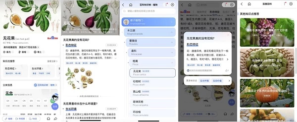 在技术方面,基于百度百科770万网友的内容贡献,2.3亿次内容版本迭代,知识探索”充分发挥百度移动生态优势,通过大数据分析,对应用户搜索需求,调用AI语言学习能力,理解并学习海量知识点信息,通过多维度策略挖掘,高效聚合多层级、多模态的结构知识,构建各词条之间的知识点关系网。根据用户搜索量的分析对应补充词条内缺少内容,实现更精准的应答。由此,用户在阅读词条的过程中,除了可以了解该植物外,还可以通过百度 AI 分析技术获取相关内容的推荐,激发用户产生好奇的新知内容,探寻新奇有趣的好玩知识点。