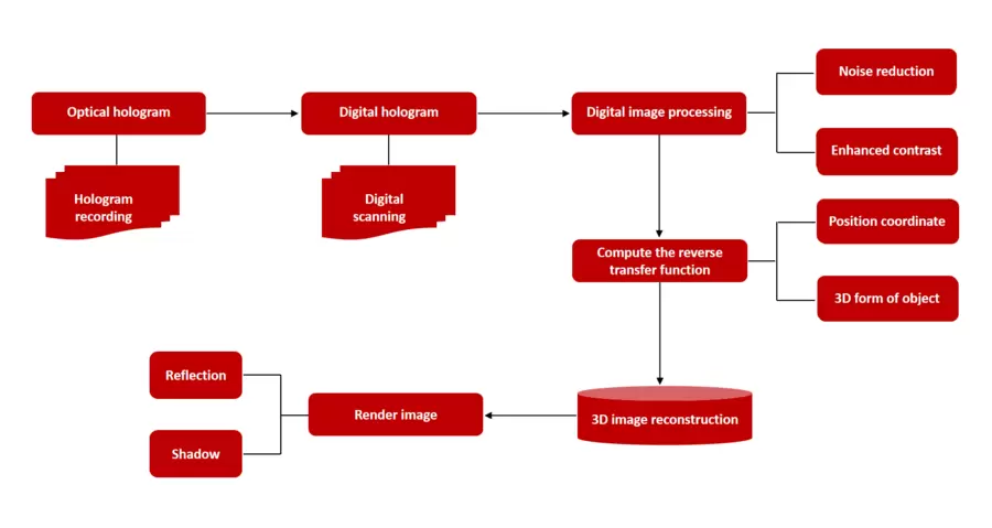 使用激光光源产生相干光束,然后让其通过物体,使光束发生散射或反射。然后将散射或反射后的光线和一个参考光束进行光干涉,形成了光学全息图。