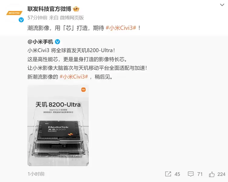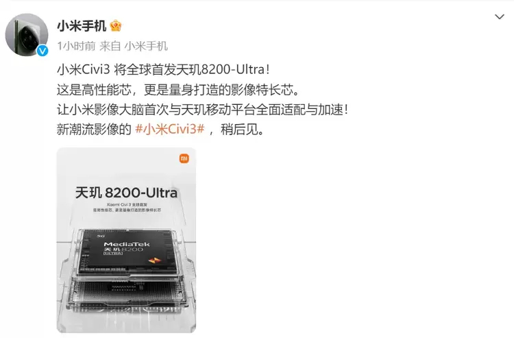 近期,联发科官宣携手小米联合定义天玑8200-Ultra移动平台。据悉,天玑8200-Ultra不仅是高性能芯,更是量身打造的影像特长芯。随后,小米手机官微宣布,小米Civi 3将全球首发搭载天玑8200-Ultra。