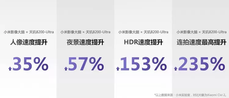 最终,在小米影像大脑框架接入与算子落地加速的双重优化下,小米影像 38 个功能首次落地天玑移动平台,相比 Xiaomi Civi 2 实现了全链路的速度优化与功耗优化。值得一提的是,连拍速度相比上代提升 235%。