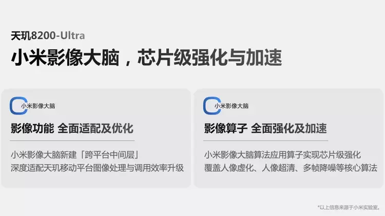 在此次联合定义中,小米影像大脑 30 余个算子在天玑 8200-Ultra 上实现了全面强化与加速,小米影像大脑中的各种能力实现随存随取,从而实现了出色的图像处理效果,与优秀的性能与功耗表现。