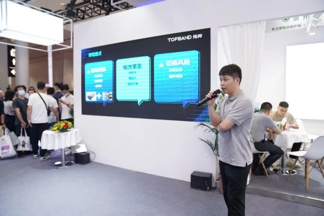 拓邦股份产品经理吴小康在展会现场进行了轻型动力车辆双包并联电池解决方案的发布