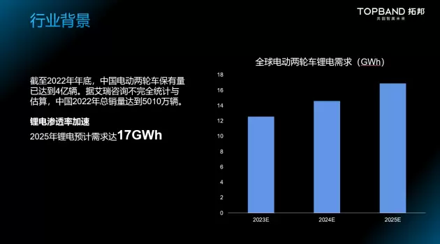 截至2022年年底,中国电动二轮车保有量已达到4亿辆。据艾瑞咨询不完全统计与估算,中国2022年总销量达到5010万辆,预计到2025年,全球电动两轮车锂电的需求将达17Gwh。