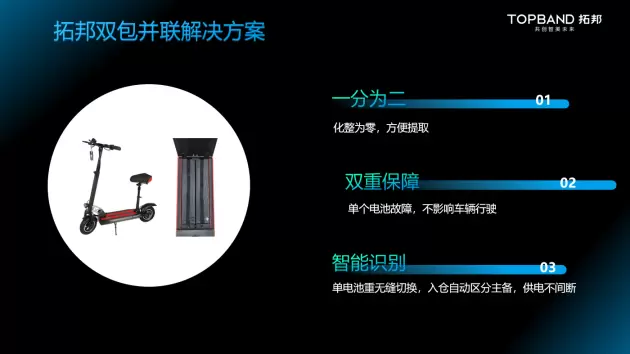 拓邦此次发布的轻型动力车辆双包并联电池解决方案可实现主备电池的自动切换,无需借助外部切换设备和控制器,产品一分为二,主备电池化整为零,方便提取,双重保障,单个电池故障,不影响车辆正常行驶。电池可完成智能识别,入仓自动区分主备,无缝切换,供电不间断,可以更好适配市场上的主流车型。