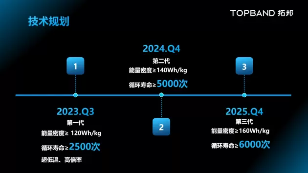 拓邦钠离子电池蓄势待发,是储能与小动力性价比之选,今年第三季度将开启全球量产交付。同时,拓邦钠离子电池将在能量密度、循环寿命等方面加速迭代,以满足客户日益增长的市场需求。从长期规划来看,到2025年,拓邦钠离子电池能够实现能量密度≥160Wh/kg,循环寿命≥6000次,引领行业变革。