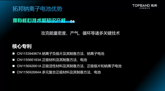 在核心技术攻关方面,拓邦钠离子电池研发团队已攻克高比能、抑制产气、长寿命等诸多关键技术,申请CN115394967A 、CN115566183A、CN115692661A、CN115692684A等多项钠离子电池相关专利,凸显了拓邦的技术优势,为钠离子电池未来的发展和应用提供了有力支持。