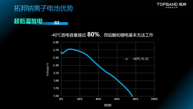 在超低温环境下,锂离子电池往往会出现电极失活、电解液流动性降低、电化学反应速率下降等问题,导致电池性能下降,而拓邦的钠离子电池在超低温环境下的表现则更加稳定,-40℃放电容量接近 80%,为客户在极端环境下的电池应用需求提供了更多可能性。