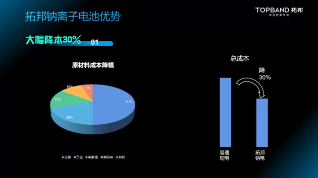 钠元素在地球上丰度排名第六,储量非常丰富,远远高于地球锂元素的含量。相比于普通锂离子电池,拓邦钠离子电池的原材料成本,正极降低约50%,负极降低约20%,电解液降低约15%,集流体降低约10%,原材料总成本可以降低约30%,帮助客户获得更高利润和更有竞争力的价格。