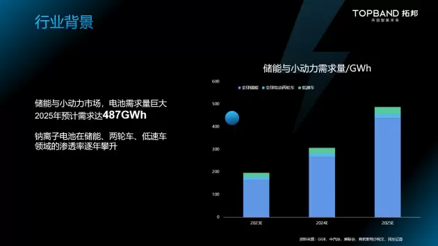 随着全球对能源环保和可持续发展的需求日益增长,新型电池技术的研究和开发已经成为了全球科技领域的热点。钠离子电池作为一种新兴的二次电池技术,在近年来受到了越来越多的关注,储能与小动力市场的电池需求量巨大,预计到2025年需求将达487Gwh。