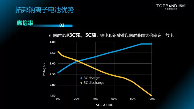 相较于锂电和铅酸难以同时兼顾大倍率充、放电,拓邦钠离子电池可同时实现3C充电、5C放电,充电20分钟,电量可达90%以上,在高倍率充放电性能方面具有独特优势,可帮助客户大幅提高电池使用效率。
