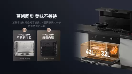 针对集成灶用户最关注的“蒸烤”容量小、不能同步进行、温度不均匀、烤制时间长等痛点,帅丰【天机3】TJ3-8B蒸烤同步集成灶采用左蒸右烤、蒸烤同步的设计,大大缩短了烹饪时间。蒸箱容量高达42L,拥有黑科技“鲸喷式发热盘”,20秒内迅速产生大量的水蒸汽,就像鲸鱼喷水一样,更大范围的穿透食物,锁鲜速蒸,还原“大锅蒸”的口感;烤箱容量高达32L,搭配空气烤锅,采用六面空气加压烤技术,高温逼出食物多余油脂,健身瘦身人群也能悦享美食。