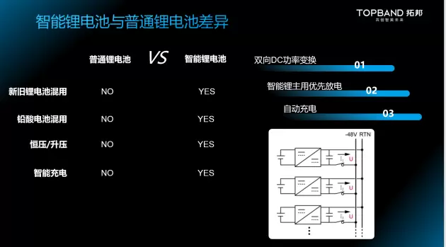 拓邦发布的智能锂电池解决方案则可完美解决上述问题,与传统普通锂电池相比,拓邦通信备电智能锂电池可实现双向DC功率变换,主用电池优先放电,自动充电等功能。