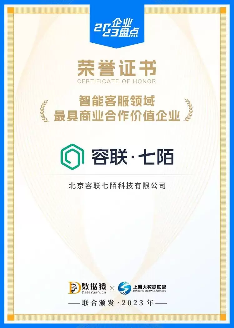 近日,数据智能产业创新服务媒体数据猿开启了 "2023 中国智能客服领域最具商业合作价值企业 " 盘点,经过申报交流、访谈调研、外界咨询评价、匿名访问等多重交叉验证,容联七陌凭借其在AI、通讯和数据方面的强大技术能力获评2023智能客服领域最具商业合作价值企业。