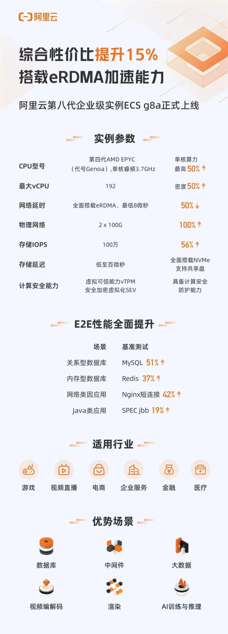其中,第八代企业级通用计算实例 g8a,单核睿频达 3.7GHz,单核算力相比上一代最高提升达 50%,综合性价比平均提升 15% 以上。主要面向泛互联网行业,适用于数据库、中间件、Web 网站等通用企业级应用,高清视频编解码、渲染、AI 训练与推理等互联网场景,综合性价比提升 15%。在 MySQL 数据库场景,性价比可以提升 35%;在 Redis KV 数据库场景,性价比可以提升 20%;在 Ngnix 企业级应用场景,性价比可以提升 25%。