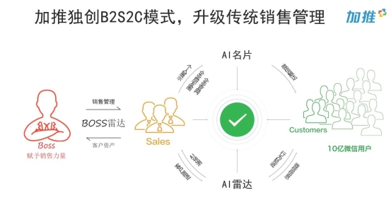 基于这套赋能型理念,加推率先提出了B2S2C(Boss to Sale to Customer)的销售模式理念,通过赋能的方式,给了销售员一套获客和成交的工具,帮助他们提升业绩,实现人效的提升;与此同时,销售员和客户之间的数据流以及客户的数据资产可以无缝同步到老板端,解决老板智能化、可视化销售管理的难题。通过“一张人工智能名片“,打通老板、销售员与客户之间的关系流和信息流,重新定义销售和销售管理。