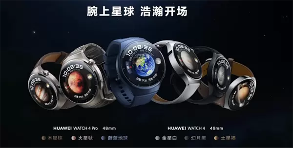 本次华为WATCH 4系列智能手表共包含WATCH 4和WATCH 4 Pro两个版本,均配备了1.5英寸AMOLED屏幕,并采用了全新的探索系列表盘,将星系藏于腕间并以星球命名,分别为蔚蓝地球、火星钛、金星白、木星棕、土星褐、幻月黑,共计6款星系表盘或配色,融合式展现了星球科技美学设计。其中,华为WATCH 4尺寸为46mm,采用不锈钢机身和3D弧面玻璃,触摸不留痕;华为WATCH 4 Pro尺寸为48mm,表壳采用航天级钛合金材质,经过注塑、脱脂、烧结、抛光等数十道工序打造而成,更加坚固耐用,并搭载了球面蓝宝石玻璃LTPO常亮屏,以圆形穹顶为设计理念,在光的照耀下,拥有天然的光影变化,尽显尊贵优雅气质。