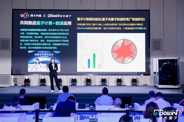2023年5月,玻色量子与清大科越股份有限公司(简称“清大科越”)在“量子+电力”领域达成深入合作,基于电力行业的实际场景与业务需求,共同打造基于光量子计算的电力能源领域实用型场景解决方案。北京清大科越股份有限公司副总裁郭梦婕代表清大科越在现场发表了案例宣讲。