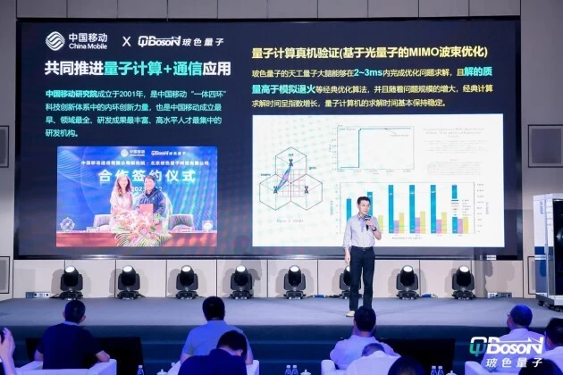 2023年3月,玻色量子与中国移动通信有限公司研究院(简称“中国移动研究院”)在“量子+通信”领域达成深入合作,以应对6G通信网络带来的算力挑战,共同打造量子计算加速解决方案。中国移动未来研究院院长崔春风代表中国移动研究院在现场发表了案例宣讲。
