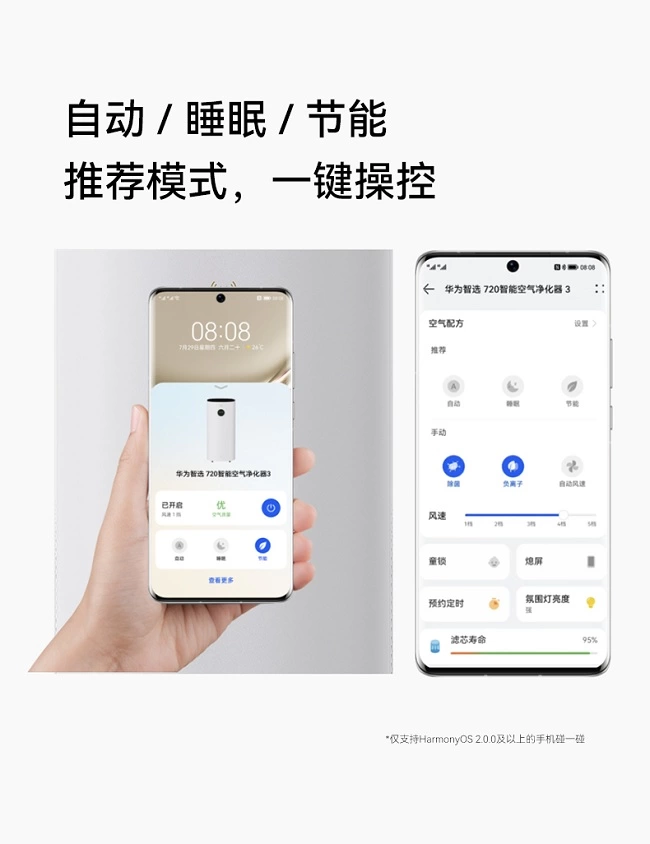 华为智选 720智能空气净化器3支持鸿蒙智联,搭载HarmonyOS Connect 一碰连标签,碰一碰无App配网。经由华为智选的加持和赋能,可实现华为智慧生活App控制、小艺语音控制、智能家居场景联动等功能,让空气净化器真正融入华为全屋智能家居生活。