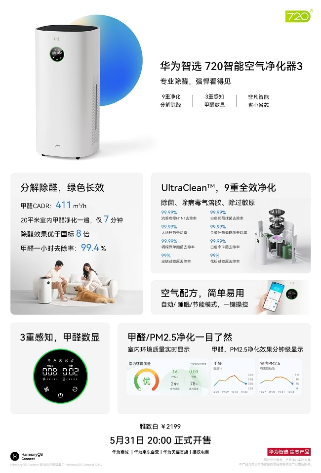 据了解,华为智选 720智能空气净化器3是¥2000档首发甲醛、PM2.5双数显的空气净化器,采用分解式除醛,可持续将甲醛分解为水和二氧化碳,无二次污染释放,绿色长效。更得益于强大的鸿蒙智联,实时感知甲醛并实现自主净化,带来清新舒适的呼吸环境,省心省电省滤芯。