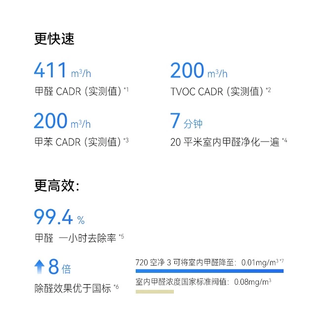 该净化器1小时除醛率为99.4%,甲醛CADR值400m³/h,可将室内甲醛降至0.01mg/m³,除醛效果优于国标8倍。