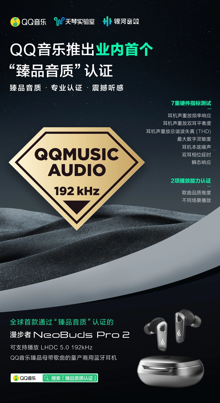 “臻品音质”认证是由QQ音乐携手腾讯音乐天琴实验室和银河音乐团队共同打造的一项针对耳机、播放器等音频硬件设备的产品标准。其采用先进的数字声音增强引擎技术,致力于将数字音乐的音质提升到更高的层次。“臻品音质“认证的推出,是国内音乐流媒体平台首次对音频硬件产品设定认证标准,这充分展现了QQ音乐在音频技术研究与开发方面的深度投入和行业领先地位。