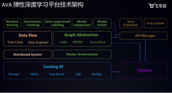“与传统的模型发布流程相比,七牛云的深度学习平台可以节省80%的人力成本,缩短50%的实现周期。”彭垚如是说。深度学习平台AVA,是一个端到端的人工智能深度学习平台,可以将复杂的富媒体数据传输至平台的人工智能神经网络中进行分析和处理,专注为计算机视觉领域提供一套完整的数据集和模型生产工具链。其中包括了每日撰写迭代训练脚本;新数据的增删和管理;增量学习和迭代学习;搭建半监督打标系统;模型的比较和融合等。基于此架构,七牛云弹性深度学习平台能大量减少标注人员的工作,短期内提升模型的能力。