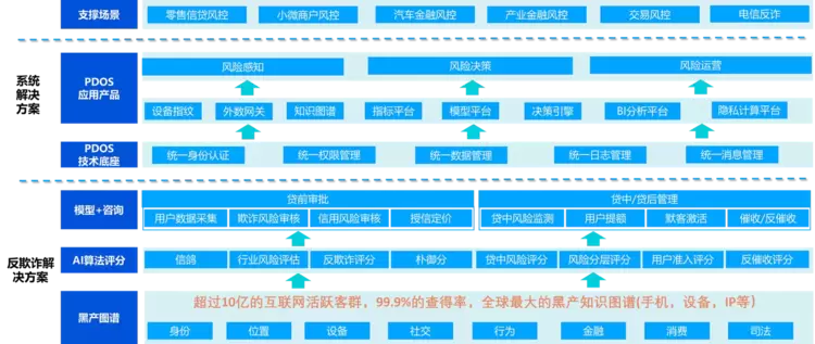 围绕银行在基础安全、业务安全、数据安全的三大应用场景痛点,隐私保护决策操作系统(PDOS)提供全周期的一站式解决方案,即通过提供一站式大数据决策工具,补齐数智化业务和人才短板,解决现有系统兼容互通的问题;针对反诈的事前、事中、事后全流程提供数据、模型、系统的综合产品方案;针对政企联动的综合金融服务平台的搭建,保证数据安全流转。