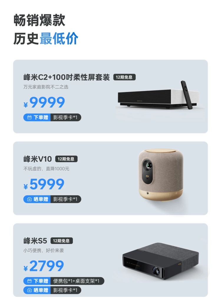 除了免息之外,峰米还有多重惊喜好礼相送!影视季卡、月卡、大师版雨伞、优惠券等贴心福利持续送,精彩剧集、生活好物一网打尽。