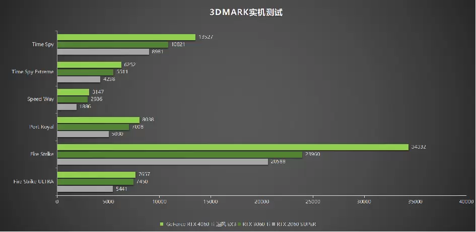从测试中不难发现,耕升 GeForce RTX 4060 Ti 追风 EX3在3DMARK中的数据,与GeForce RTX 3060 Ti 和GeForce RTX 2060 SUPER可以拉开了一定的差距,耕升 GeForce RTX 4060 Ti 追风 EX3在Fire Strike 的分数测试钟甚至一度来到了34332分,而在 Port Royal测试中也一度来到了8038的分数。说明耕升 GeForce RTX 4060 Ti 追风 EX3是拥有一定实力的。