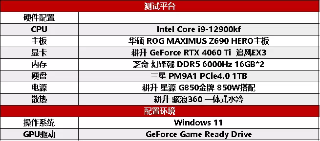 本次测试环节使用了Intel Core i9-12900k,主板方面使用的使用ROG MAXIMUS Z690 HERO主板,内存方面启用2条芝奇 幻锋戟 DDR5 6000Hz 16GB,电源采用的是 耕升 星源 G850金牌 850W,散热方面则是 耕升 骇浪360 一体式水冷,这套配置可以为GPU提供大量降温以及供电 ,驱动则更新至刚刚发布的最新版本GeForce Game Ready Drive。这套配置完全足够让耕升 GeForce RTX 4060 Ti 追风 EX3在测试中拥有稳定且强劲的发挥。