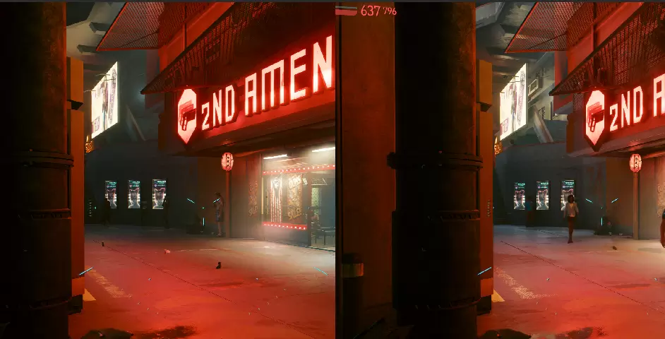 DLSS3帧生成技术是此次GeForceRTX40系显卡的重要更新,在此次更新中实现了在不牺牲甚至是提升画质的情况下,使帧率进行大幅度的提升,以下视图可以看出,开启DLSS3后画面基本没有变动,同时部分画面仍然有质感上的提升。