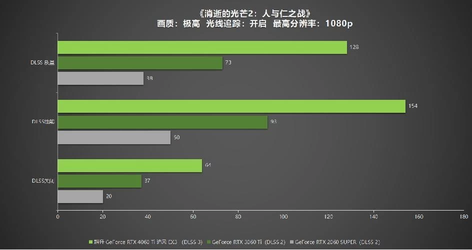 《消逝的光芒2:人与仁之战》的DLSS适配较为优秀,在1080P分辨率光追开启DLSS 性能模式下,GeForce RTX 3060 Ti 和GeForce RTX 2060 SUPER的帧率 93和50帧,比起未开启DLSS前提升幅度高达150%左右,同时耕升 GeForce RTX 4060 Ti 追风 EX3在开启 DLSS 3 性能模式后帧率一度来到了154帧,这个提升幅度可谓是令人震惊的,可见 DLSS 技术对于次世代 游戏的体验优化相当重要。同时开启DLSS 质量模式下,耕升 GeForce RTX 4060 Ti 追风 EX3的帧率也一度来到了128帧,相比未开启时既保证了流畅度的提升,同时画质也持于一个优秀的水平。