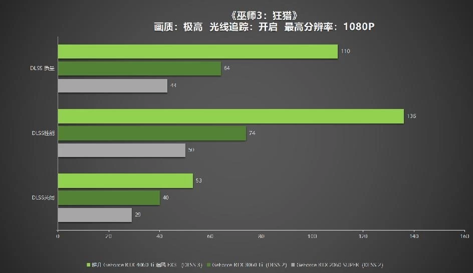 1080P下的《巫师3》优化相当不错,不开启DLSS的情况下耕升 GeForce RTX 4060 Ti 追风 EX3即可以达到53帧的正常游玩帧率,开启DLSS 性能模式后,游戏的帧率一度提升至136帧,DLSS质量模式的提升幅度也高达105%。GeForce RTX 3060 Ti 和GeForce RTX 2060 SUPER在开启DLSS 2 的游戏模式后也能得到较为流畅的游戏体验。