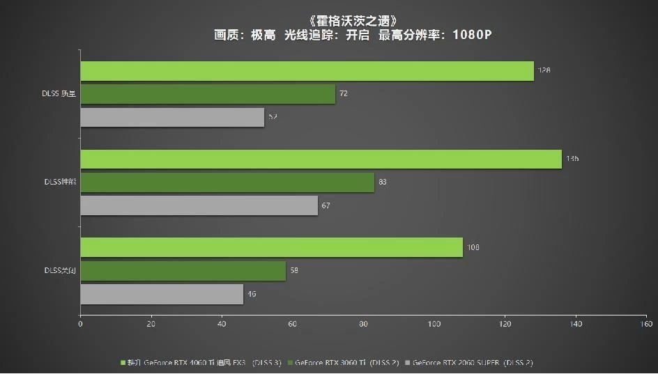 转变为2K画质后,耕升 GeForce RTX 4060 Ti 追风 EX3的表现依旧亮眼,开启DLSS 3 质量模式和 DLSS 3性能模式时,游戏的帧率提升近120%,在优越画质和极致流畅度下,玩家可以尽情的领略美好的魔法世界。而GeForce RTX 3060 Ti 和GeForce RTX 2060 SUPER则相对更加依赖DLSS技术一些,通过NVIDIA DLSS 性能模式,帧数分别可以达到70帧和60帧。