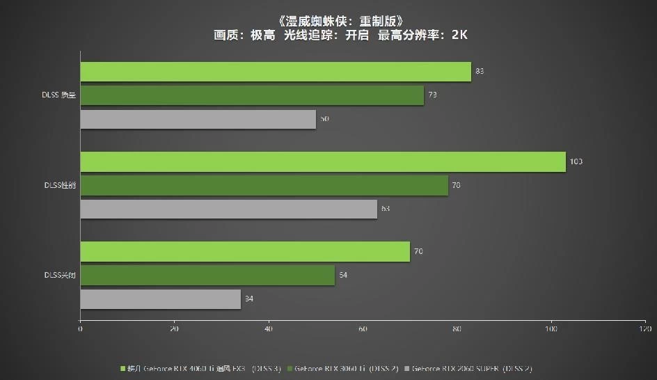 2K分辨率下游戏耕升 GeForce RTX 4060 Ti 追风 EX3同样拥有卓越表现,不开启DLSS时帧率来到 70帧,在开启DLSS 3 后同样拥有优秀的提升幅度,开启DLSS 质量模式 和DLSS 性能模式后,游戏帧率分别提升至 83帧和103帧。而GeForce RTX 3060 Ti 和GeForce RTX 2060 SUPER在不开启DLSS 2时运行流畅较为一般,在DLSS质量模式下帧数分别来到73帧和50帧。