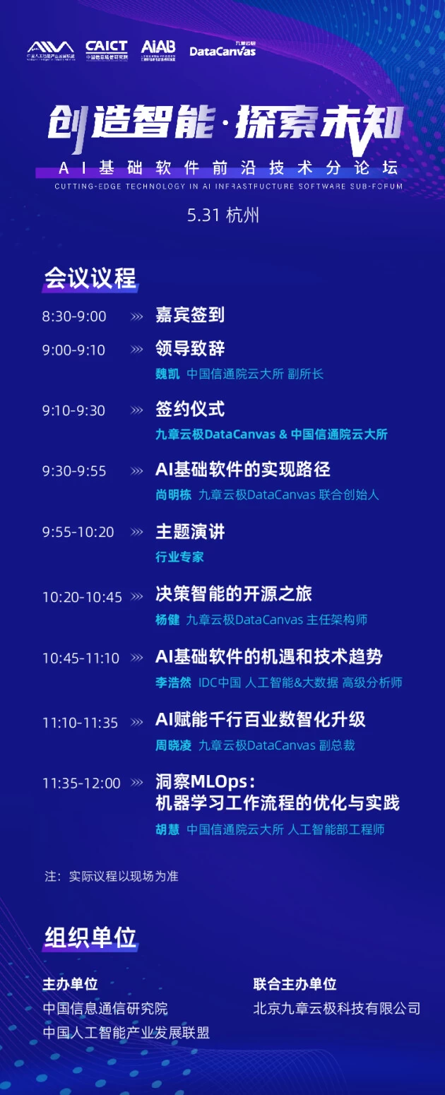 作为“杭州通用人工智能论坛暨AIIA人工智能产业发展大会”的一项重要论坛活动,“AI基础软件前沿技术分论坛”由中国信息通信研究院、中国人工智能产业发展联盟主办,北京九章云极科技有限公司联合主办,将于5月31日在杭州正式召开。本次论坛以“创造智能·探索未知”为主题,将重点关注AI基础软件前沿技术,挖掘人工智能基础软件+大模型为人工智能产业带来的新增长,探讨AI工程化在实际应用中所面临的挑战与机遇,不断夯实我国AI基础设施的融合发展。
