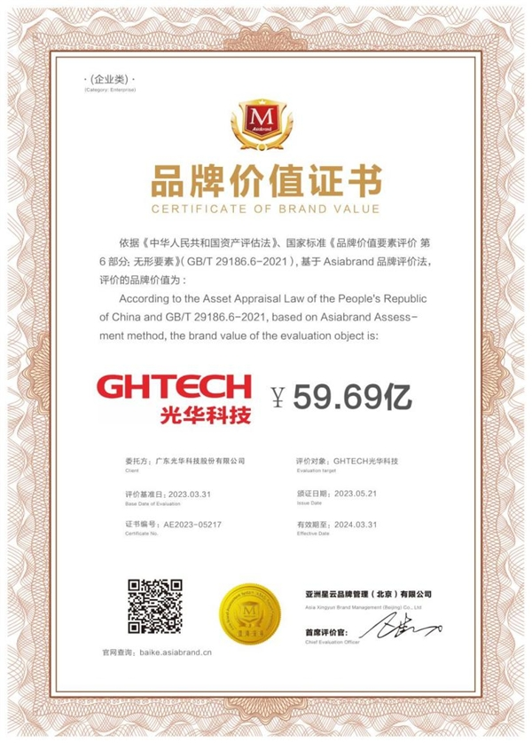 同时,根据《中华人民共和国资产评估法》、国家标准《品牌价值要素评价 第6部分:无形要素》(GB/T 29186.6-2021),基于Asiabrand品牌评价法,光华科技品牌价值获评价59.69亿元,创新指数高达518.21分,光华科技凭借在创新领域的突出表现与产业贡献,一并斩获本届的““中国品牌日·百佳创新力品牌”。